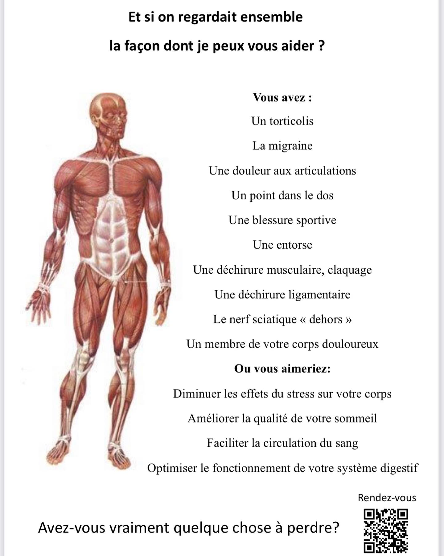 Que vous veniez apaiser une douleur, relâcher une tension ou préparer votre corps à l'effort, je vous accueille avec bienveillance et professionnalisme.